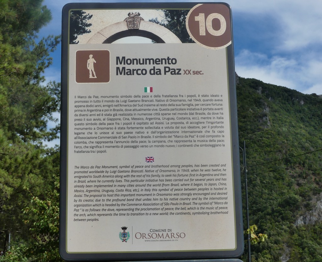 All’entrata del paese ci accoglie il monumento “Marco da Paz“, un opera contemporanea portatrice di un messaggio di pace, realizzata qui ed in altre città del mondo, tra cui Assisi, da un cittadino originario di Orsomarso emigrato nelle Americhe nel 1949.
