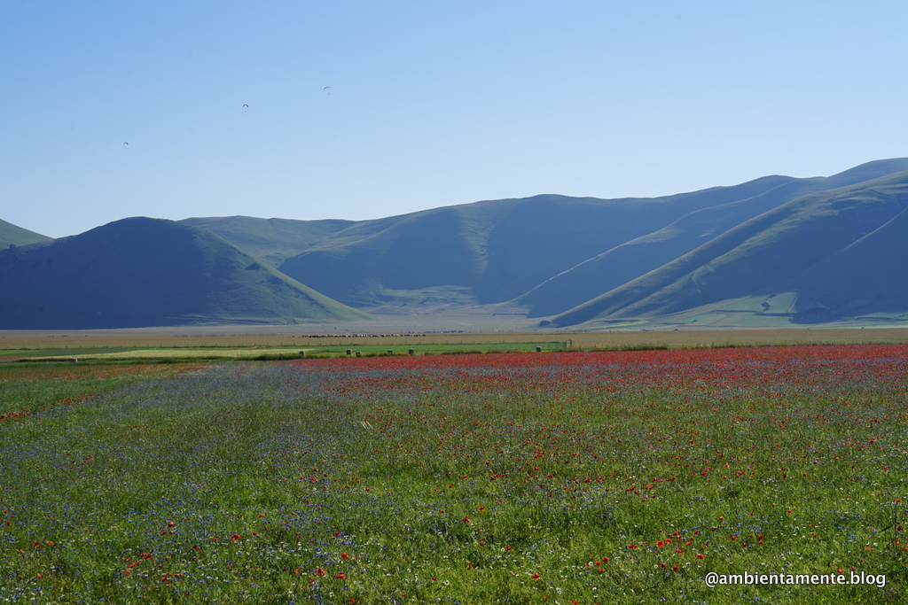 Il clima quest’anno ha ostacolato la semina dei campi ed anche se una recente grandine ha inciso negativamente sulla fioritura, margherite, fiordalisi e papaveri, si accompagnano comunque ai piccoli fiori bianchi della lenticchia.